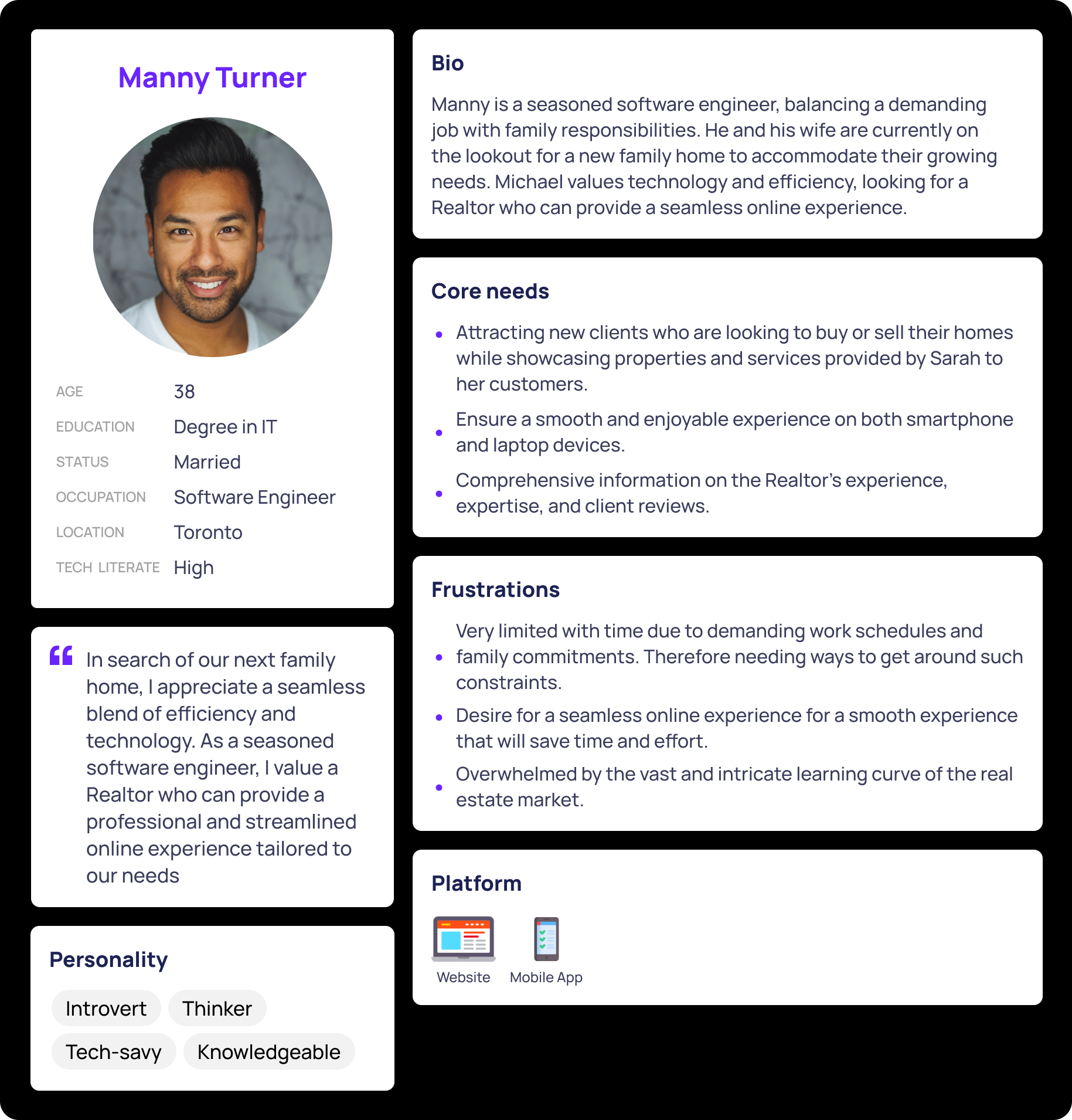 When conducting user research, I was able to take down pain points and core needs of user from the previous client and online real estate websites and create a persona representing them. Below I have a persona of a Realtor and a user. I made both personas to break down both the stakeholder and user needs. For better understanding of the process and emotions Manny would go through, I created a user storyboard to better empathize with users. I was also able to think of possible user flows and pain points that could affect the user experience.