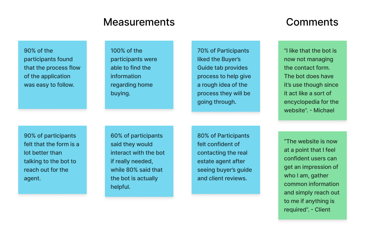 The final design has conveyed user confidence of 80% through resources such as reviews and having information about the Realtor such as their values and process. All participants were able to find information that I had asked for with the means of navigating or using the chat bot. The use of the bot is summed up very well through what Michael said during the second usability study "I like that the bot is now not managing the contact form. The bot does have it’s use though since it acts like a sort of encyclopedia for the website." Almost all users felt that the website was simple to navigate through the site. All in all, the client was satisfied saying, "The website is now at a point that I feel confident users can get an impression of who I am, gather common information and simply reach out to me if anything is required”.