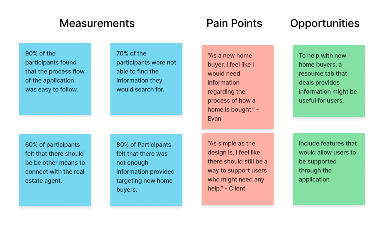 I conducted a usability study on the high fidelity model I created. With the sample pool of 10 people, I gave users the same exercises and questioned them regarding their choices and emotion after task completion. I noted down points that I found could help better the user experience. I found that 60% users wanted more ways to connect with the agent and 80% of users still felt that there was missing information for new home buyers.